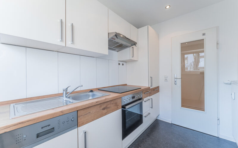 Die Küche ist mit einer Einbauküche und Geräten von Gorenje ausgestattet.
