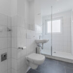 modernes Tageslicht-Duschbad mit Waschmaschinenanschluss