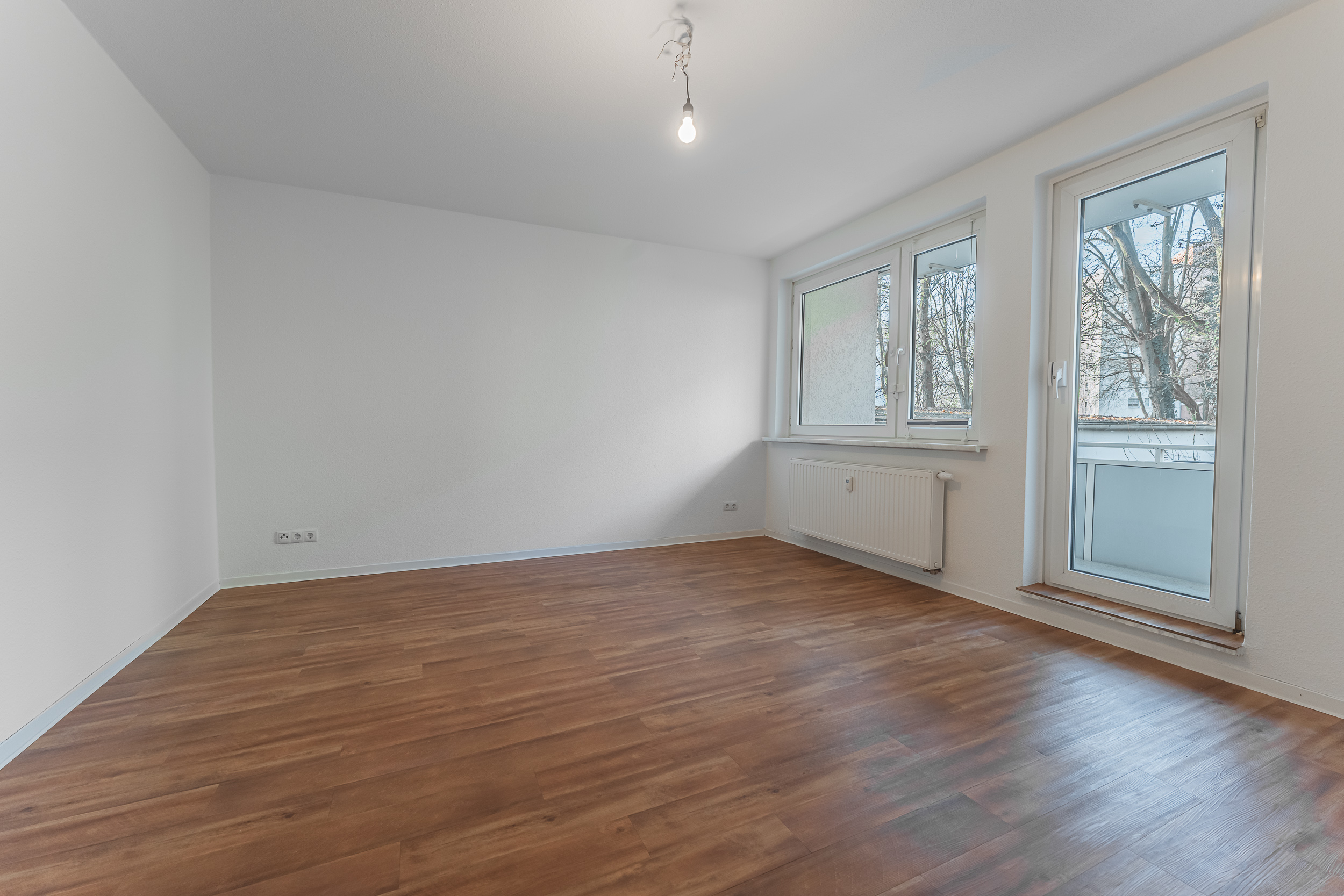 Das helle Wohnzimmer bildet den Mittelpunkt der Wohnung und bietet direkten Zugang zum Balkon. Dieser eröffnet einen angenehmen Blick ins Grüne und verfügt zusätzlich über einen praktischen Abstellbereich.