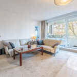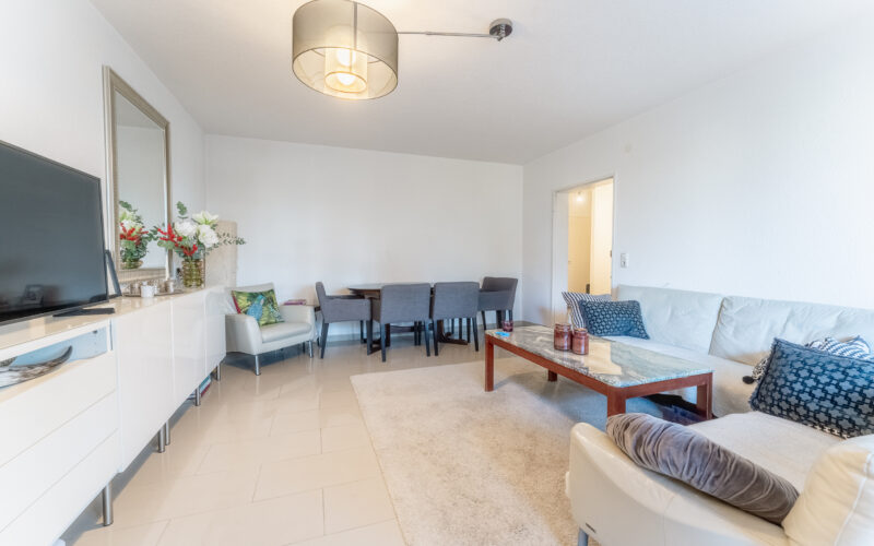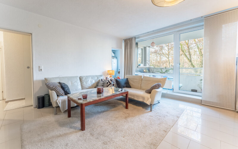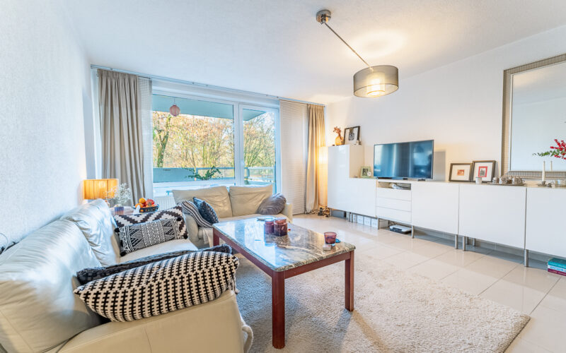 Das großzügige Wohnzimmer bildet das Herzstück der Wohnung und besticht durch seine Helligkeit sowie den Zugang zum Balkon. Hier können Sie den Ausblick ins Grüne genießen.