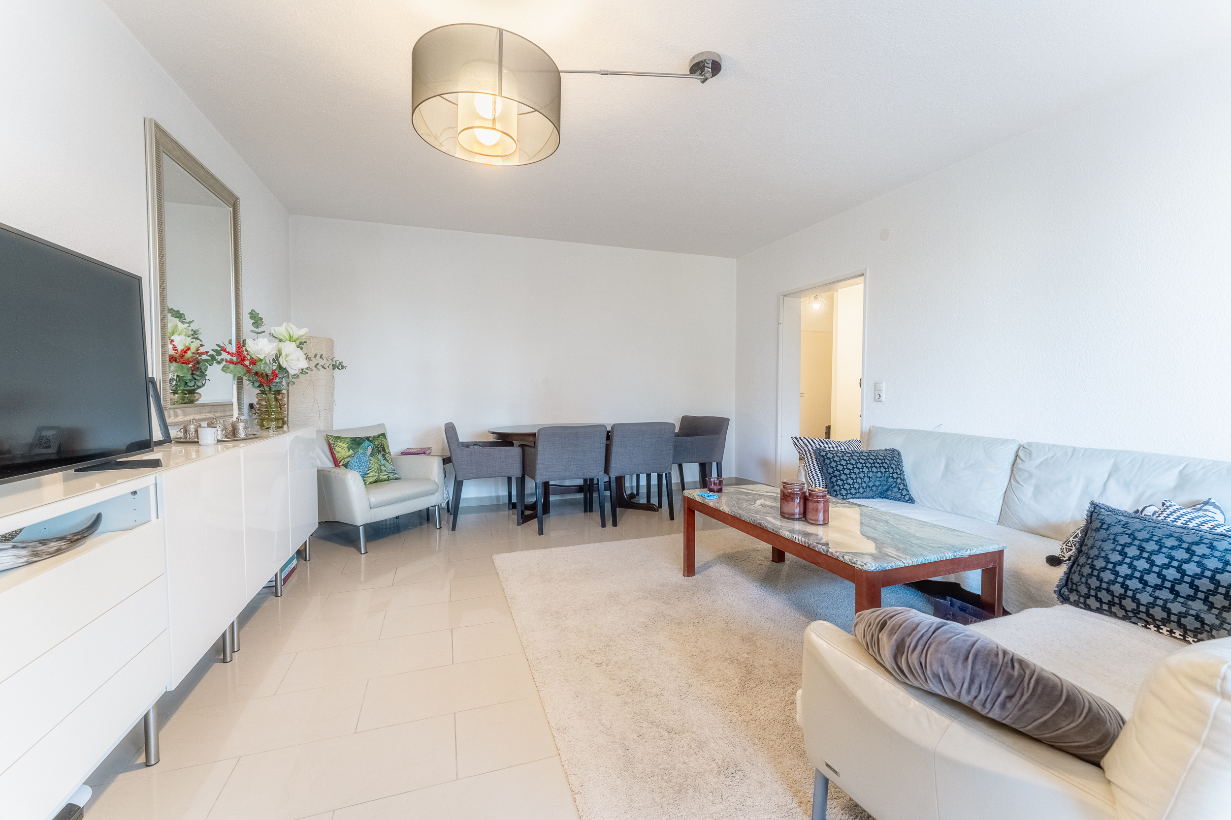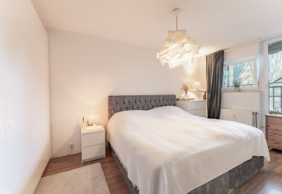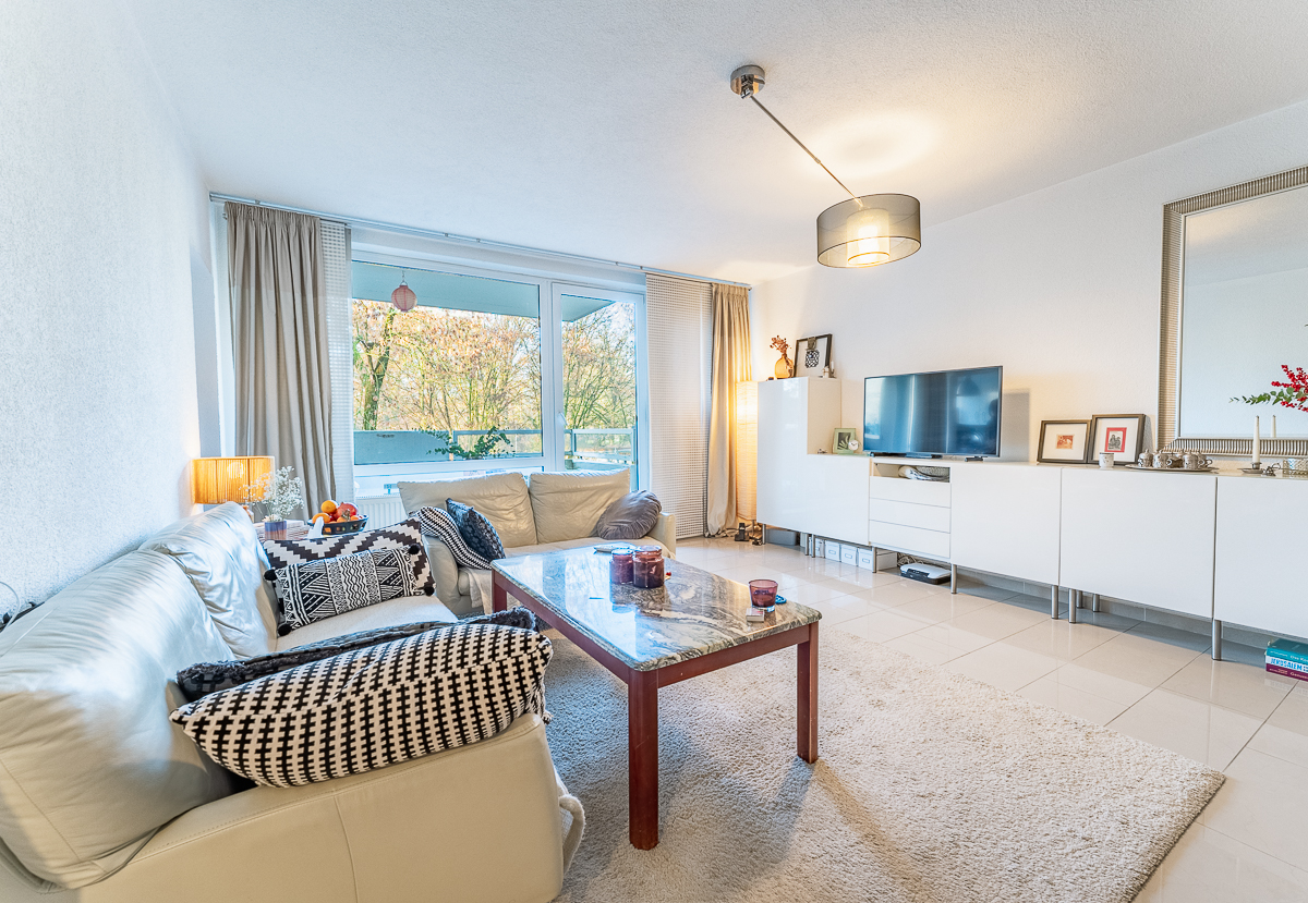 Das großzügige Wohnzimmer bildet das Herzstück der Wohnung und besticht durch seine Helligkeit sowie den Zugang zum Balkon. Hier können Sie den Ausblick ins Grüne genießen.
