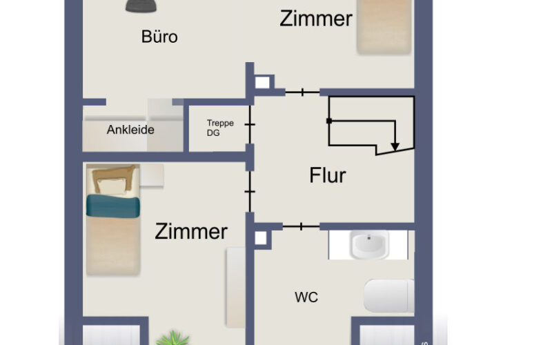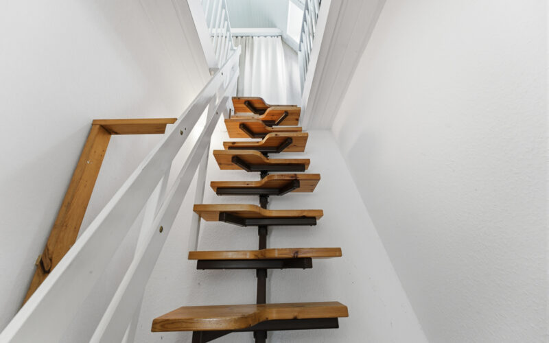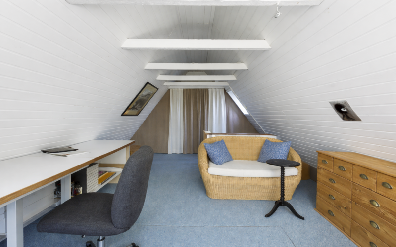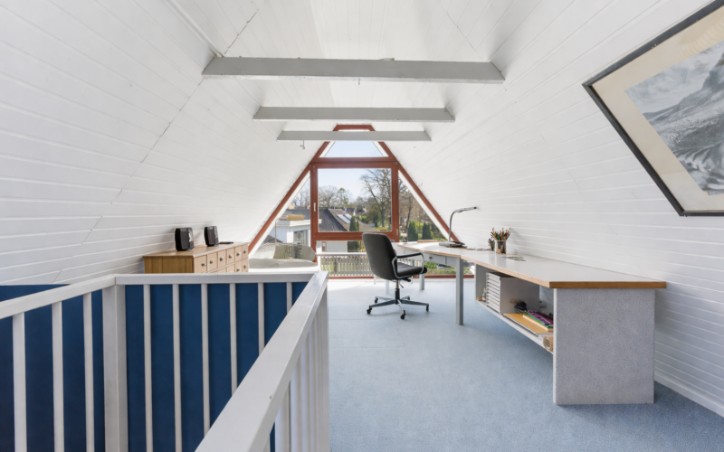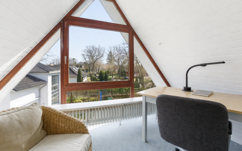 Der wohnlich ausgebaute Spitzboden ist über eine Raumspartreppe erreichbar und verfügt über ein großes Fenster, wodurch eine angenehme Belichtung gewährleistet ist.