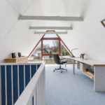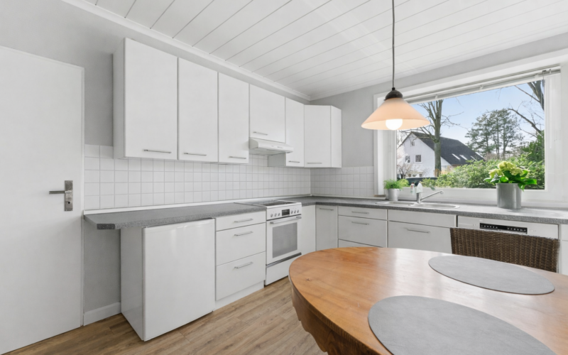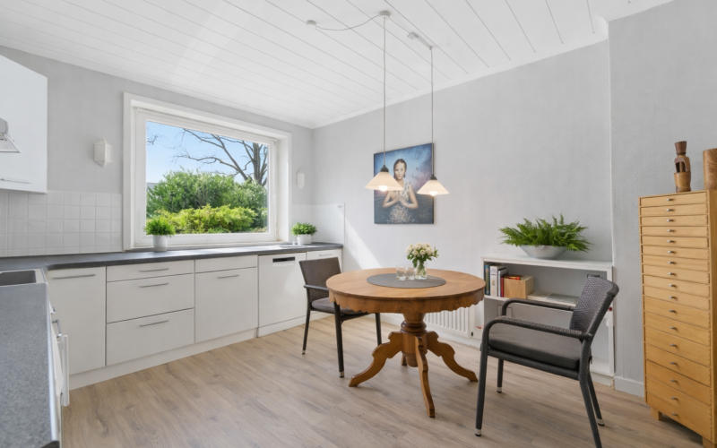 Die Küche ist mit einer Einbauküche ausgestattet und bietet ausreichend Platz für einen Frühstücksbereich. Ergänzt wird das Erdgeschoss durch einen Hauswirtschaftsraum, ein Vollbad mit Dachfenster sowie ein weiteres Zimmer, das sich ideal als Schlafzimmer oder Büro eignet.