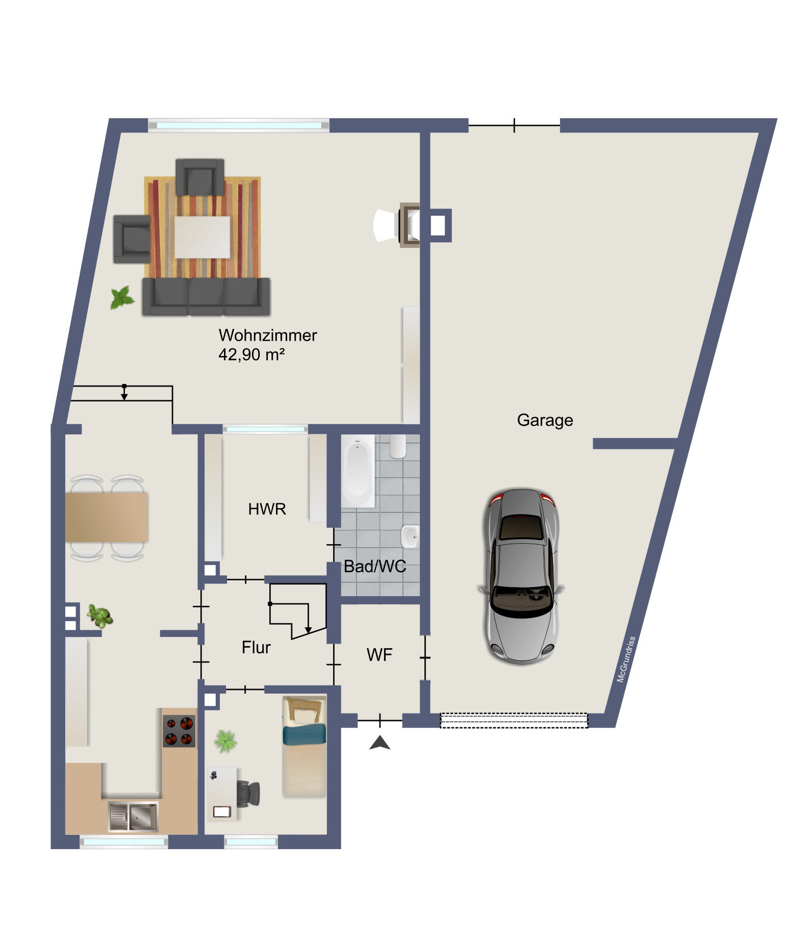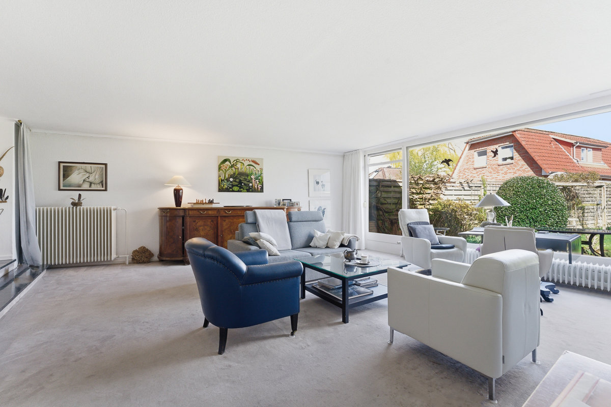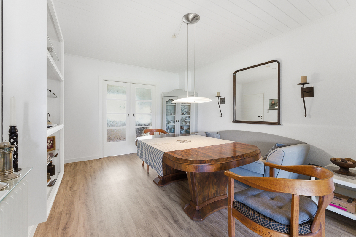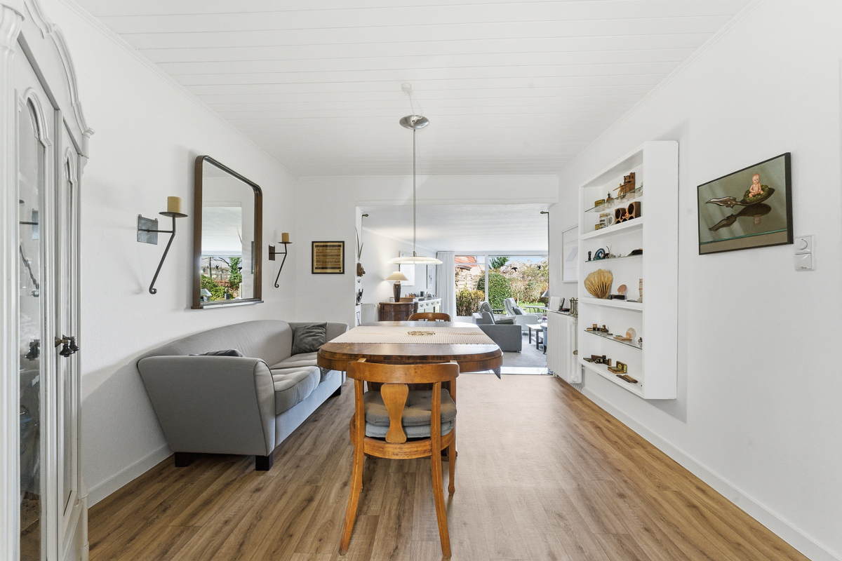 Der Zugang zum Haus erfolgt über einen gepflegten Vorgarten. Ein Windfang führt in den zentralen Flur, von dem aus sämtliche Räume des Erdgeschosses erreichbar sind. Das Herzstück der Immobilie bildet das ca. 42 m² große Wohn- und Esszimmer, das durch seine Großzügigkeit sowie die große Fensterfront mit Blick in den Garten überzeugt. Von hier aus besteht direkter Zugang zur Terrasse, die zu entspannten Stunden im Freien einlädt.