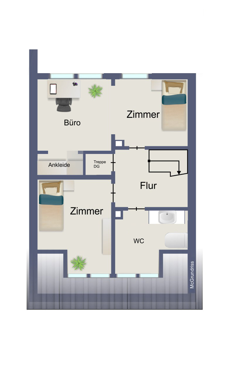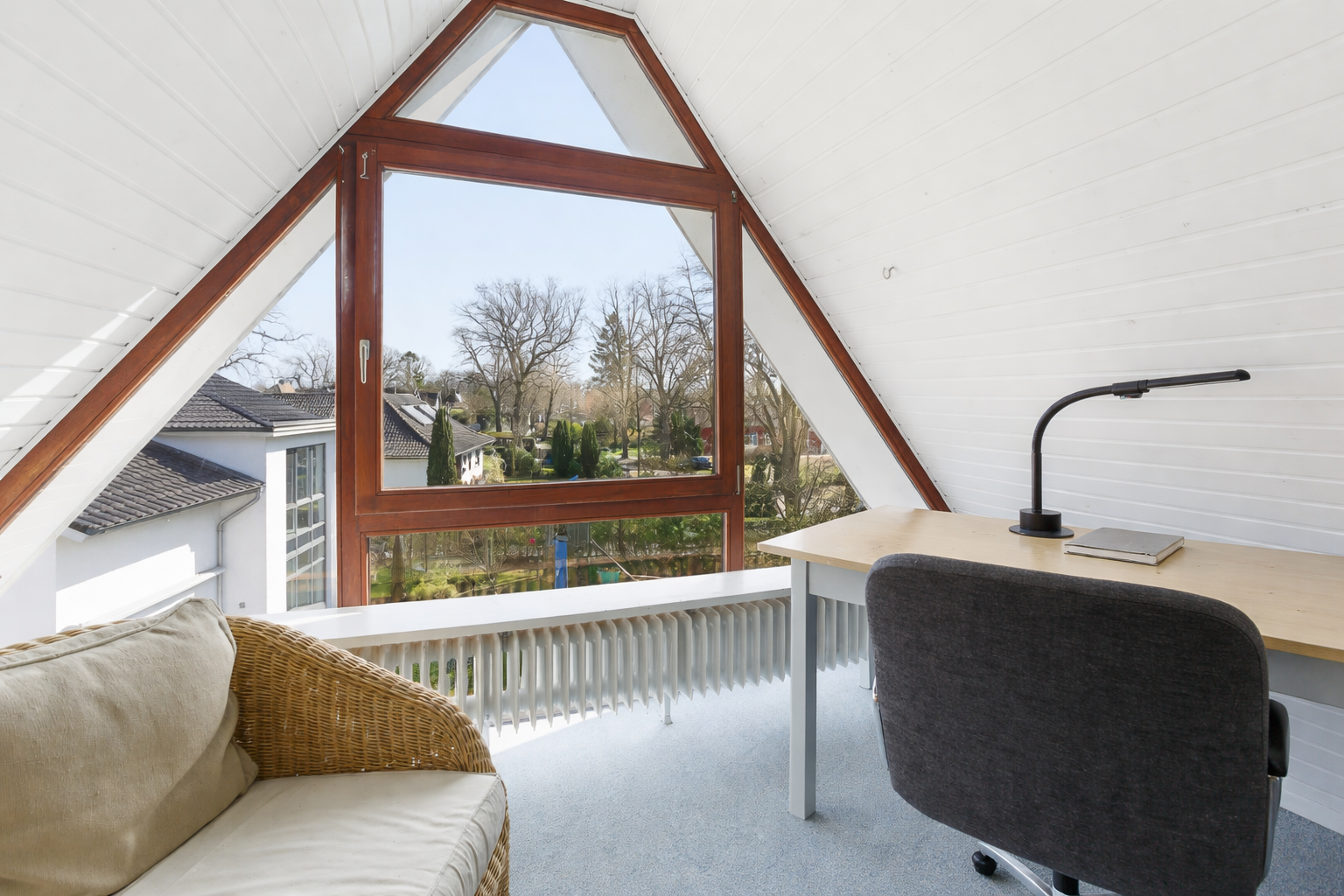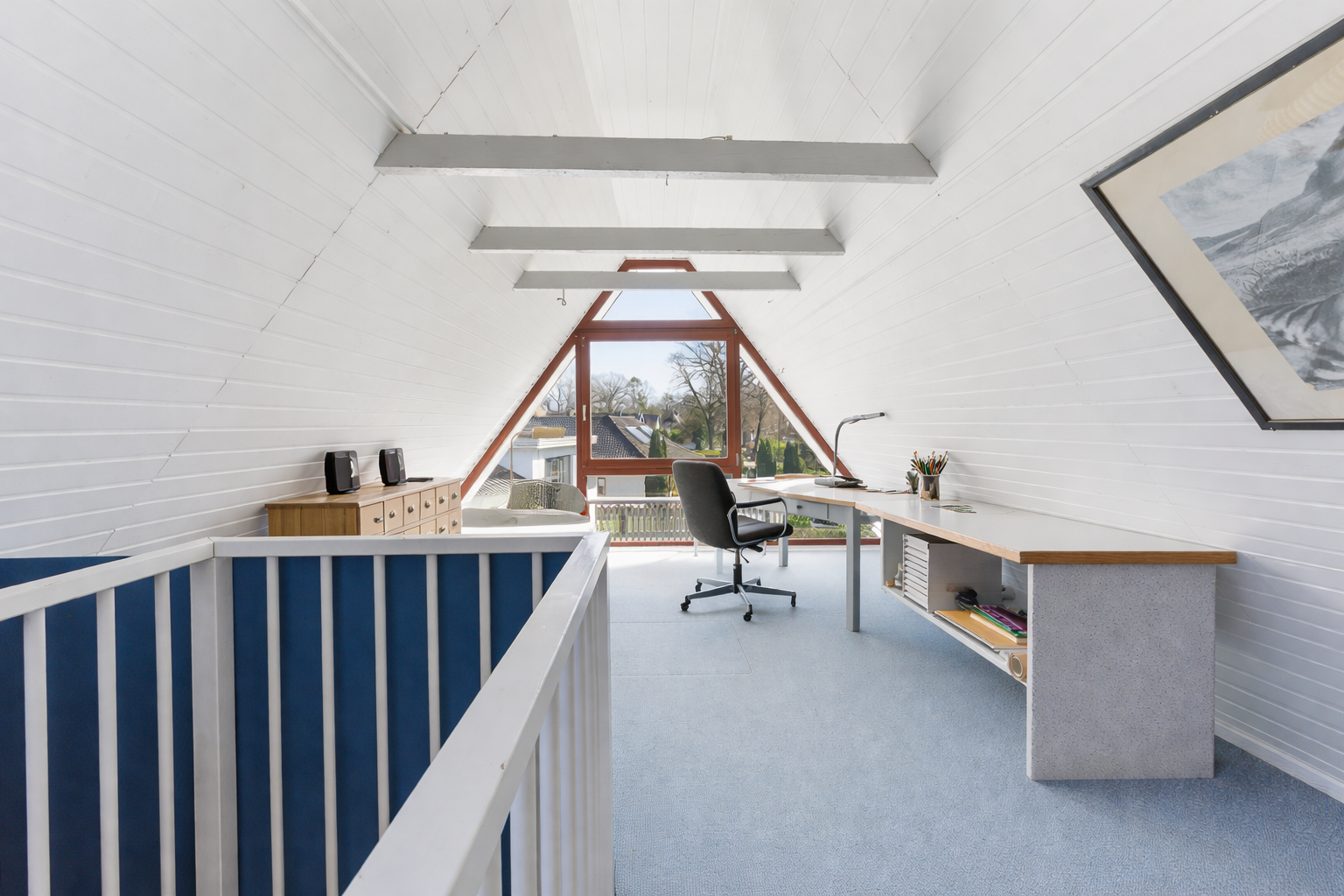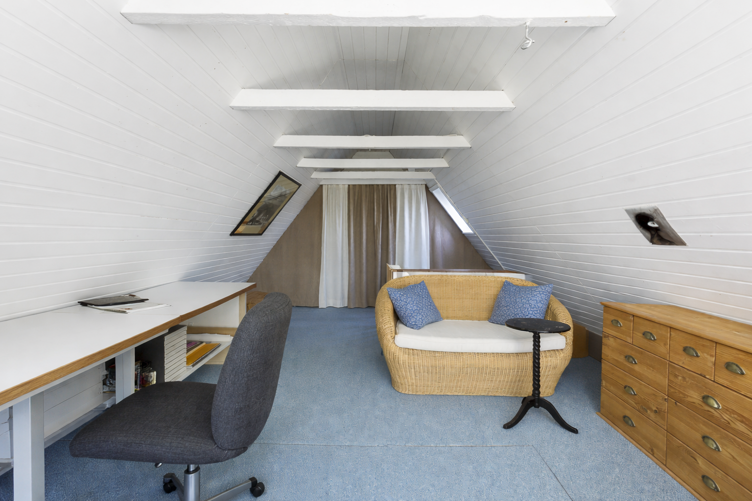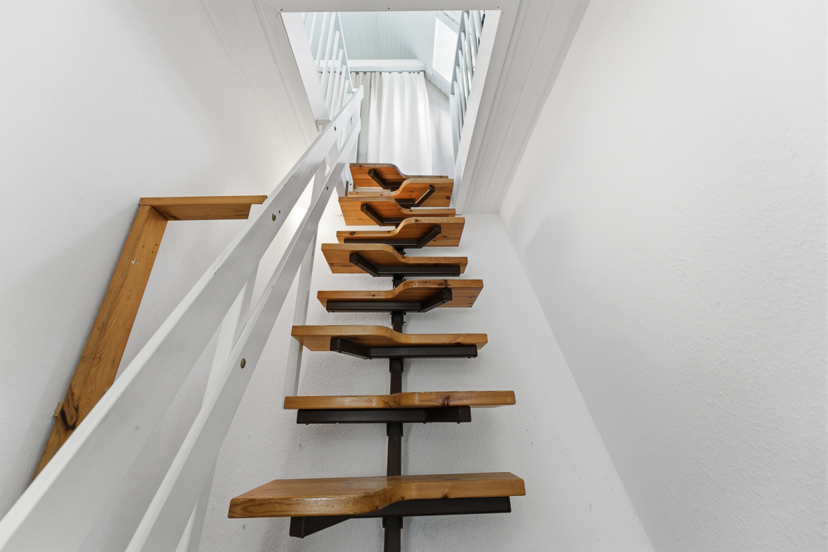 Der wohnlich ausgebaute Spitzboden ist über eine Raumspartreppe erreichbar und verfügt über ein großes Fenster, wodurch eine angenehme Belichtung gewährleistet ist.
