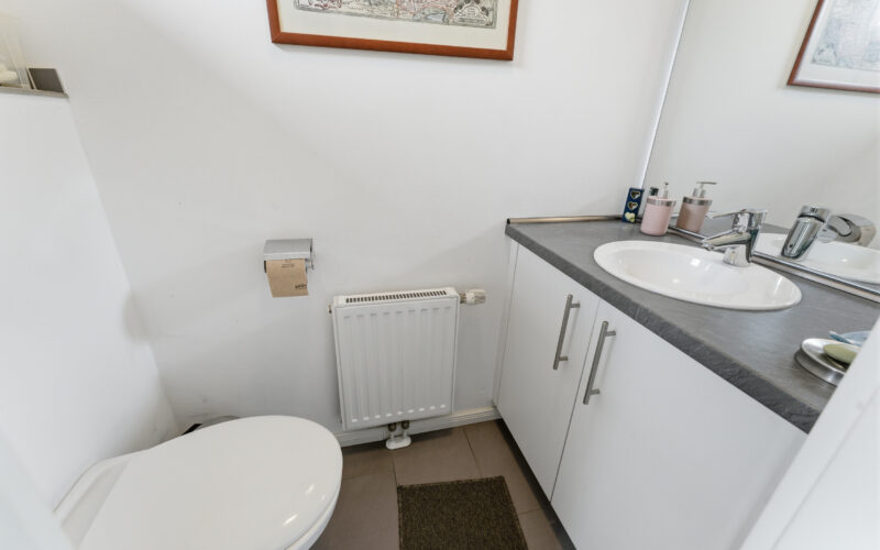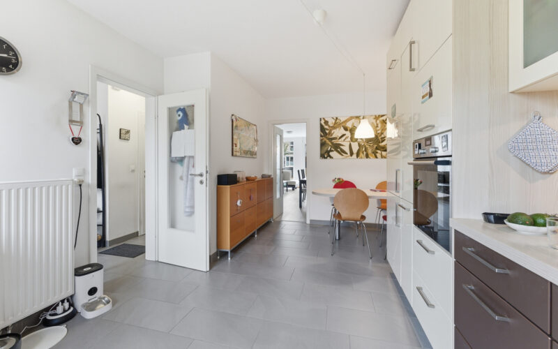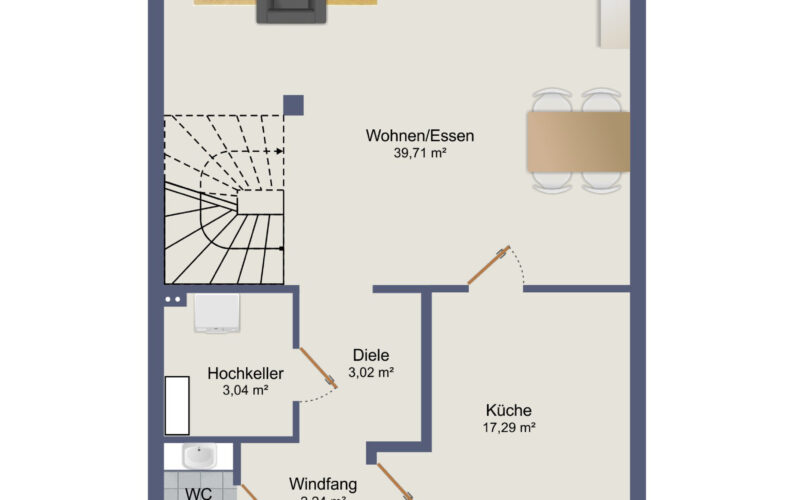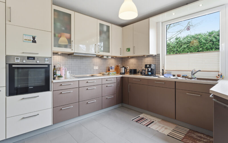 Die Küche ist mit einer hochwertigen Einbauküche aus dem Hause Nolte ausgestattet und bietet weiteren Platz für einen Frühstückstisch. Ergänzt wird das Erdgeschoss durch ein Gäste-WC sowie einen praktischen Abstellraum mit Anschlussmöglichkeiten für eine Waschmaschine.