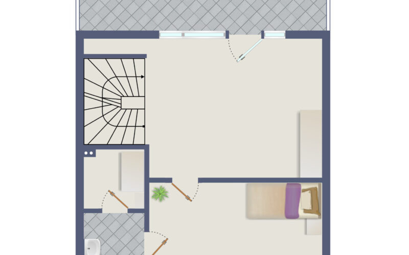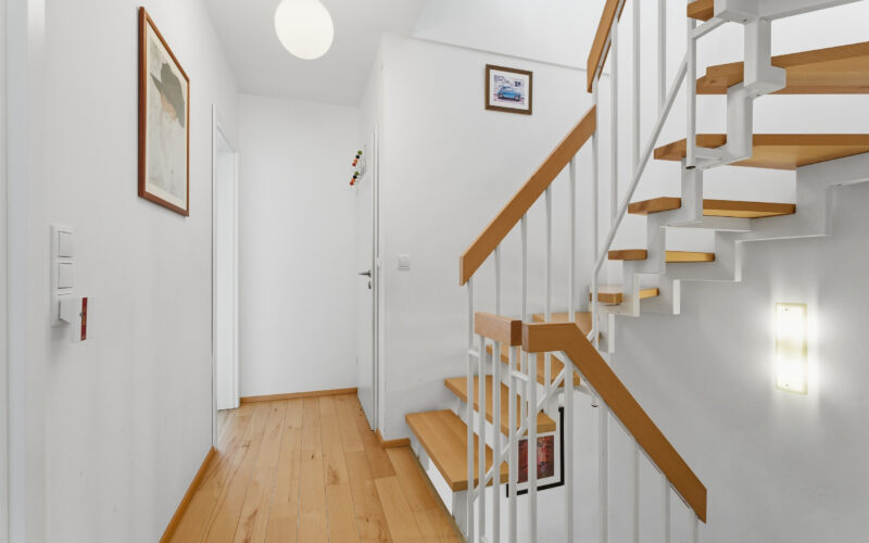 Das Dachgeschoss bildet ein weiteres Highlight der Immobilie. Hier befindet sich eine großzügige Galerie mit Parkettboden und bodentiefen Fenstern, die Zugang zur Dachterrasse bieten. Zusätzlich verfügt diese Ebene über ein innenliegendes Duschbad. In einem separaten Abstellraum ist die Gastherme untergebracht.