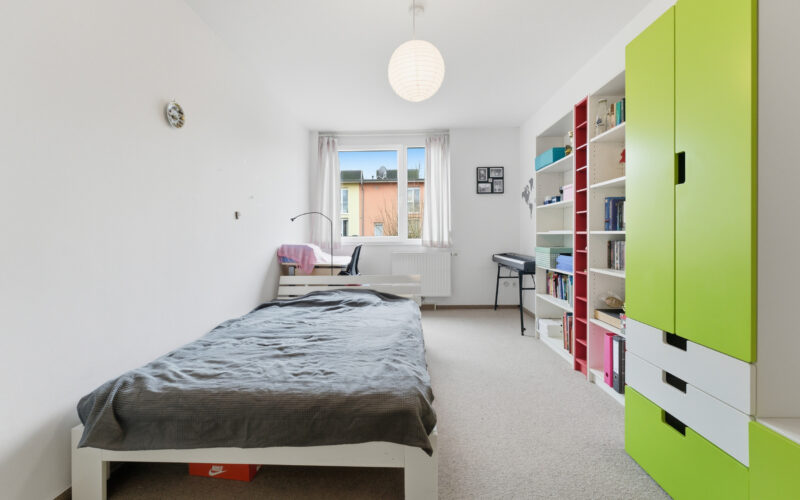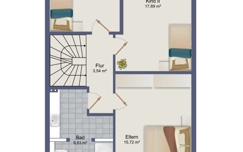 Im Obergeschoss befinden sich die Schlafzimmer sowie ein Tageslicht-Vollbad. Die Zimmer überzeugen durch ihre angenehme Größe von ca. 15 m², ca. 12 m² und ca. 17 m².