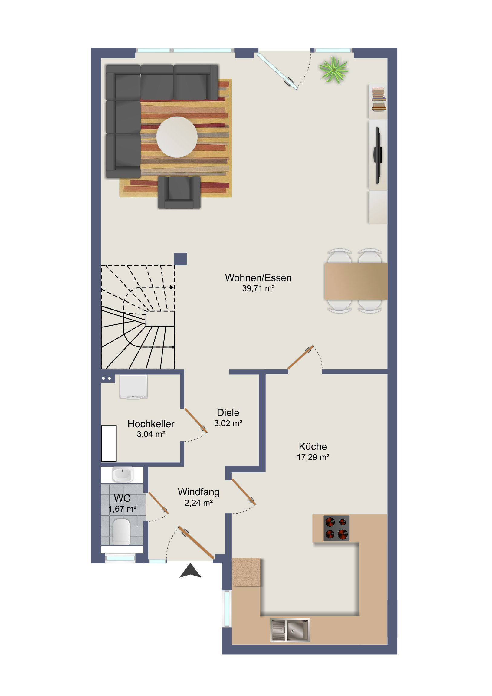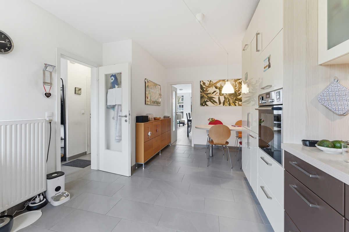 Die Küche ist mit einer hochwertigen Einbauküche aus dem Hause Nolte ausgestattet und bietet weiteren Platz für einen Frühstückstisch. Ergänzt wird das Erdgeschoss durch ein Gäste-WC sowie einen praktischen Abstellraum mit Anschlussmöglichkeiten für eine Waschmaschine.
