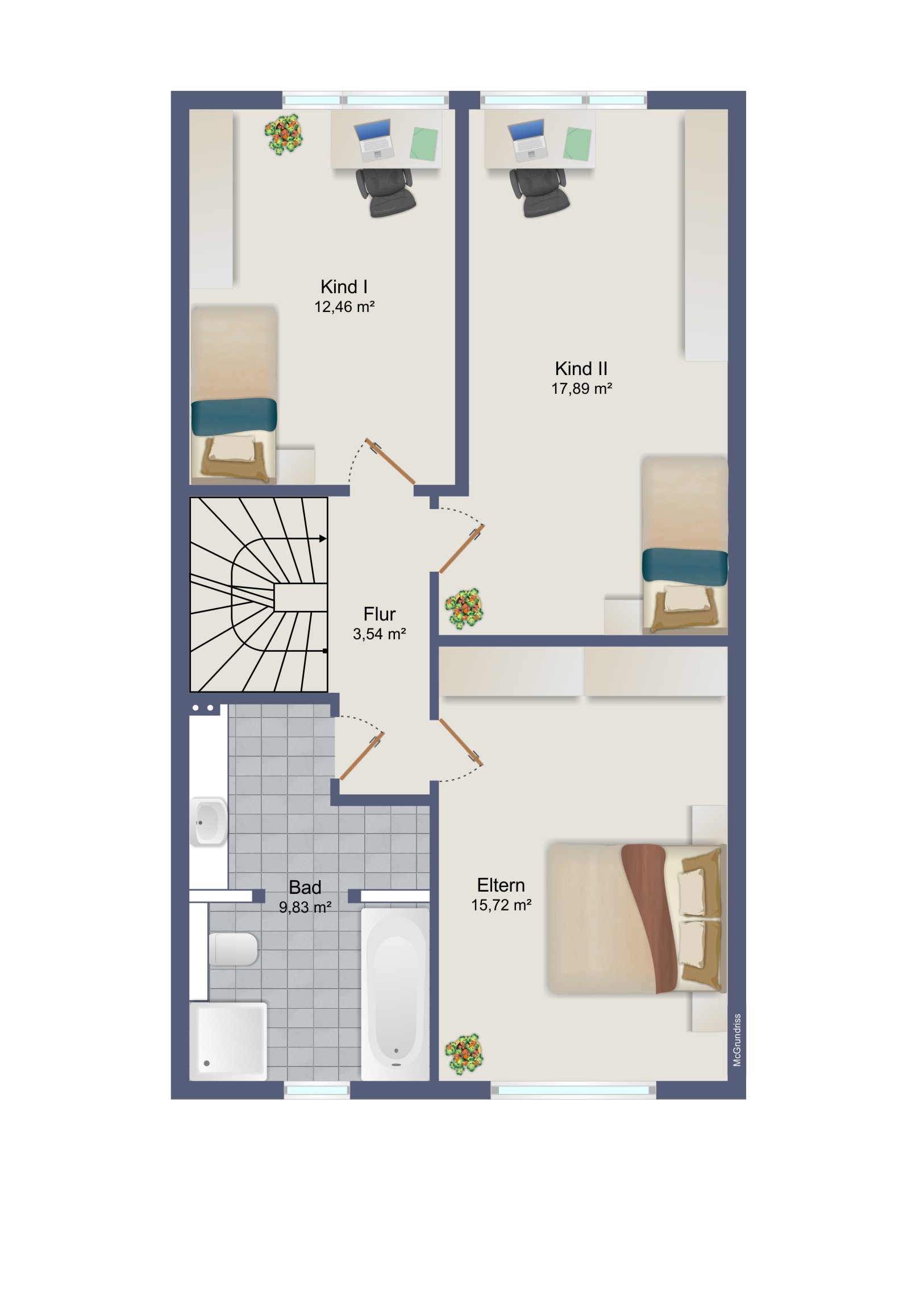 Im Obergeschoss befinden sich die Schlafzimmer sowie ein Tageslicht-Vollbad. Die Zimmer überzeugen durch ihre angenehme Größe von ca. 15 m², ca. 12 m² und ca. 17 m².