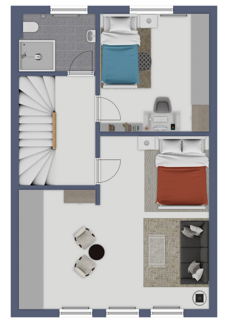Im Obergeschoss stehen zwei gut geschnittene Schlafzimmer verschiedener Größe zur Verfügung, die sich ideal als Kinder-, Arbeits- oder Gästezimmer eignen. Außerdem befindet sich hier ein Tageslichtbad mit Dusche.