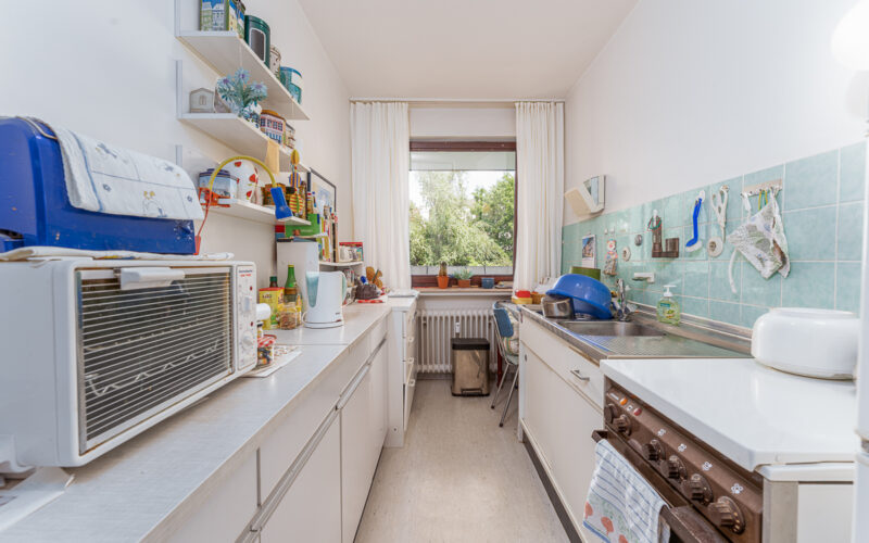 Die Küche ist separat begehbar und funktional geschnitten. Das innenliegende Badezimmer ist mit einer Badewanne ausgestattet. Ein praktischer Abstellbereich innerhalb der Wohnung sowie ein zugeordneter Kellerraum bieten zusätzlichen Stauraum.